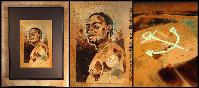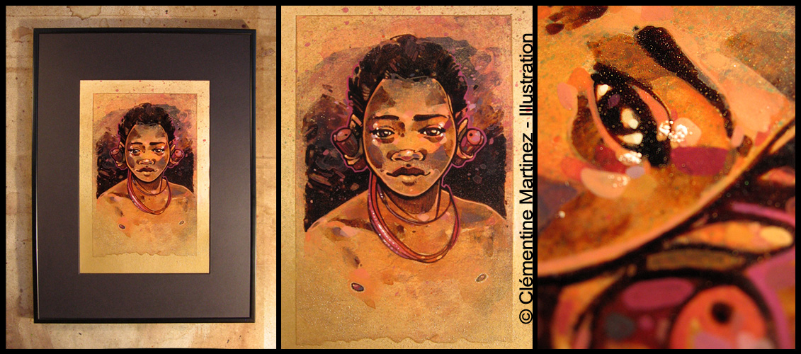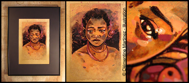 Techniques au café et gouache sur papier marouflé - Marie-Louise noire et cadre aluminium noir